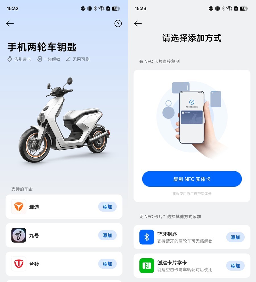 此外,它还支持两轮电动车智能互联,手机变身NFC车钥匙,一碰解锁,还支持蓝牙无感解锁,搭配全场景NFC,可录入门禁、公交、银行卡等各类卡片,出行一刷即过,便捷高效。